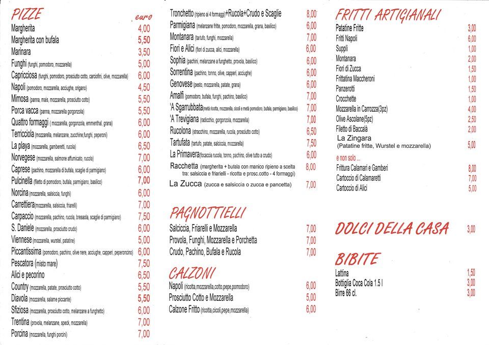 A disposizione per le ordinazioni, oltre ai tipici fritti napoletani, una vastissima scelta di circa cinquanta differenti tipi di pizze, sia bianche che rosse, rigorosamente cotte in forno a legna secondo la tradizionale ricetta napoletana. Gli impasti sono totalmente naturali e preparati con farina di alta qualità, senza additivi, e vengono lasciati lievitare per quarantotto ore, come insegna la tradizione.